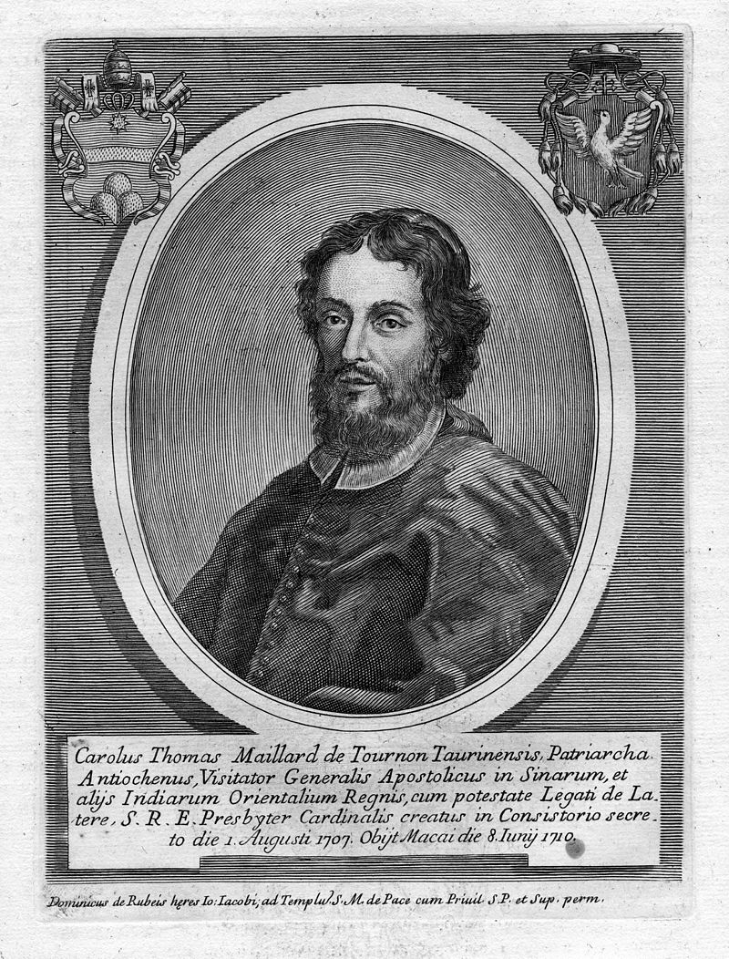 1703년에 교황 클레멘트 11세는 이 문제들을 한 번에 모두 해결하겠다는 생각으로 안디옥의 로마 가톨릭 총대주교 드 뚜르농(Patriarch de Tournon)에게 중국과 인도의 현장에 관련된 전권을 주고 특사로 파견하였습니다. 프랑스 출신의 드 뚜르농은 젊고 다소 충동적인 사람으로서 두 나라 중 어떤 나라도 경험하지 못했을 뿐 아니라 그 문제를 깊이 이해하지도 못한 상태였습니다. 그는 남인도 폰디체리에 8개월 동안 머물렀는데, 이 때 불행하게도 병을 앓게 되었습니다.