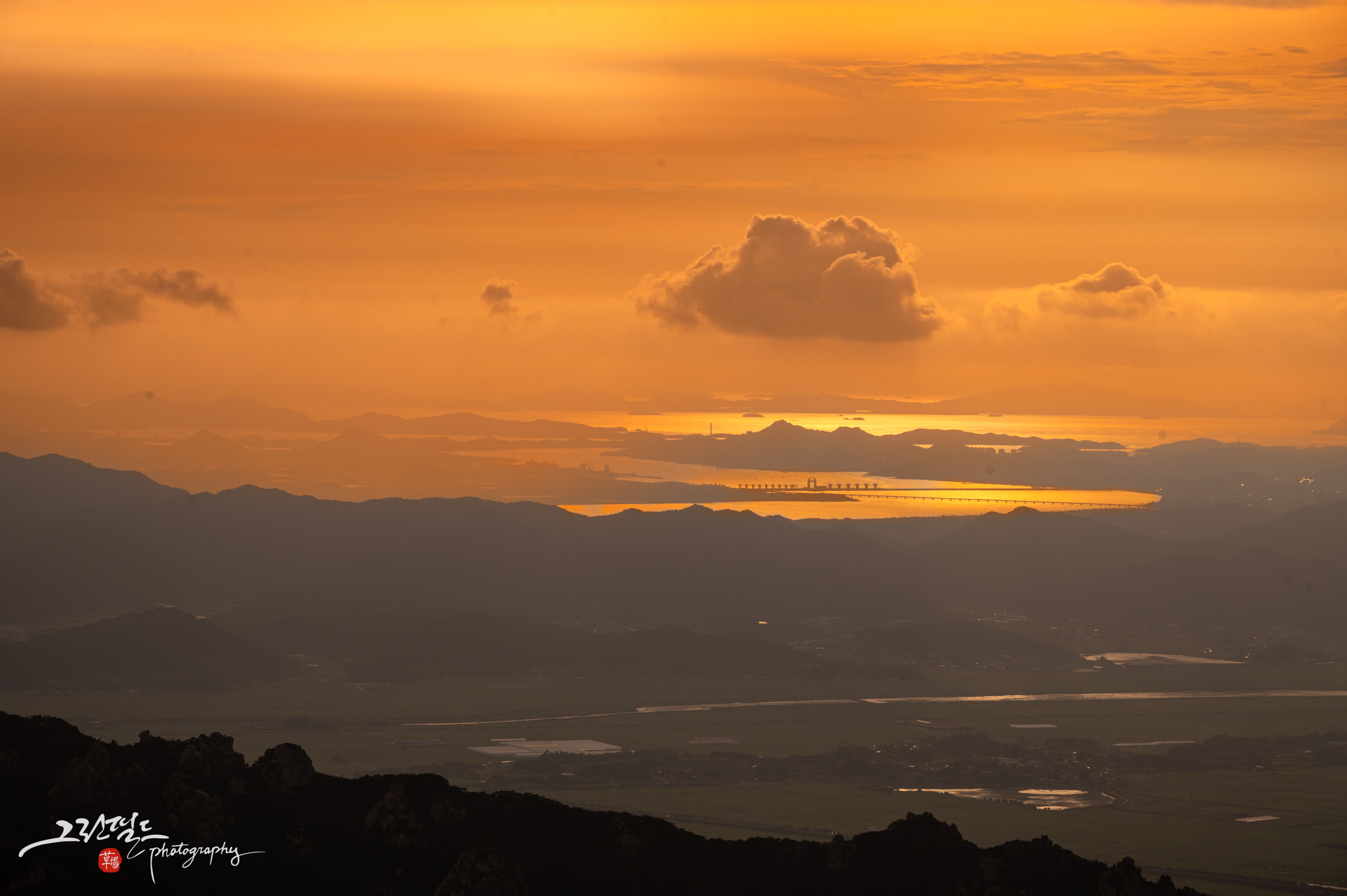 월출산 정상에서 바라본 목포 앞바다의 일몰 풍경입니다.