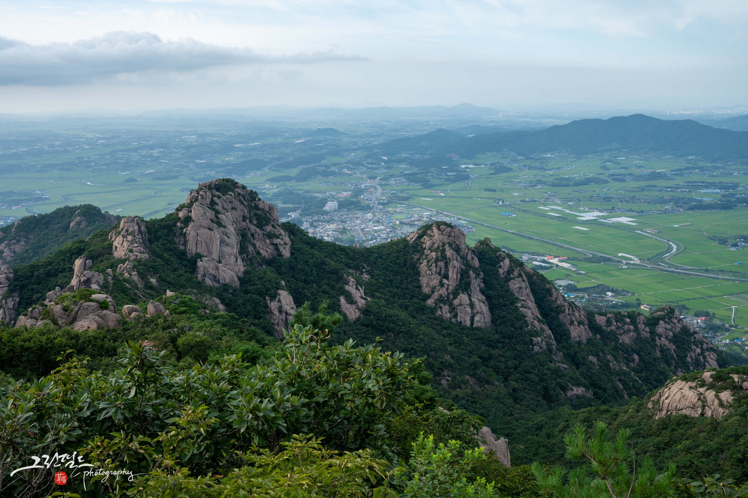 산 아래 마을들을 굽어보는 듯한 육형제바위의 장엄한 모습입니다.