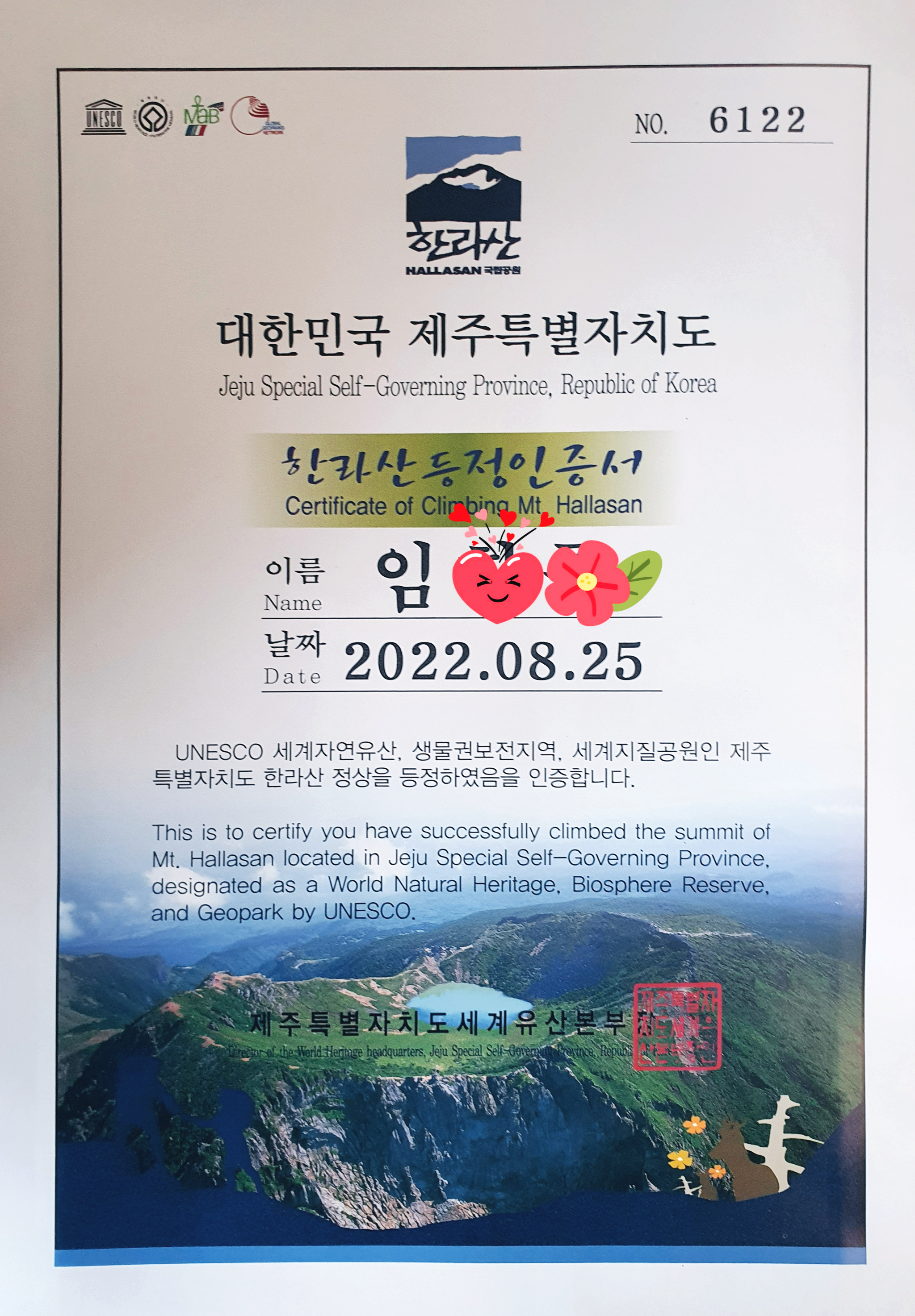 마지막으로 성판악 국립공원사무소에서 받은 등정인증서입니다...^^
