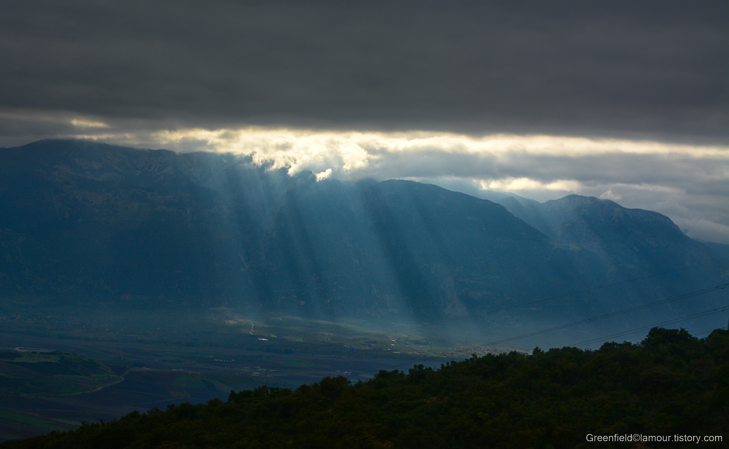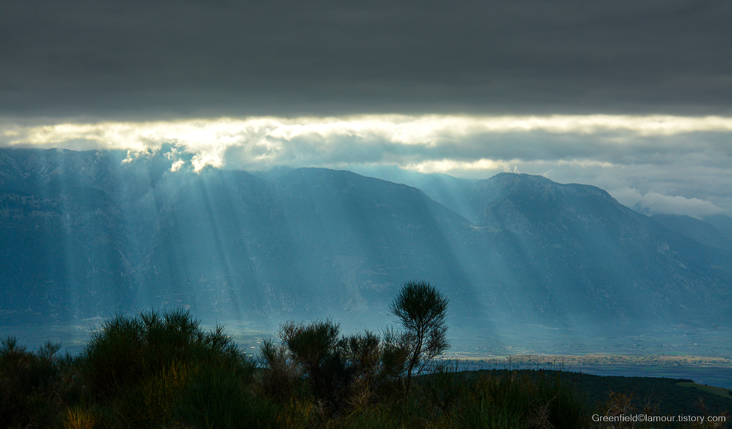한참을 달렸을까, 오른쪽으로 펼쳐진 거대한 산맥에 걸린 검은 구름에서 마치 은혜의 빛줄기가 쏟아진다.