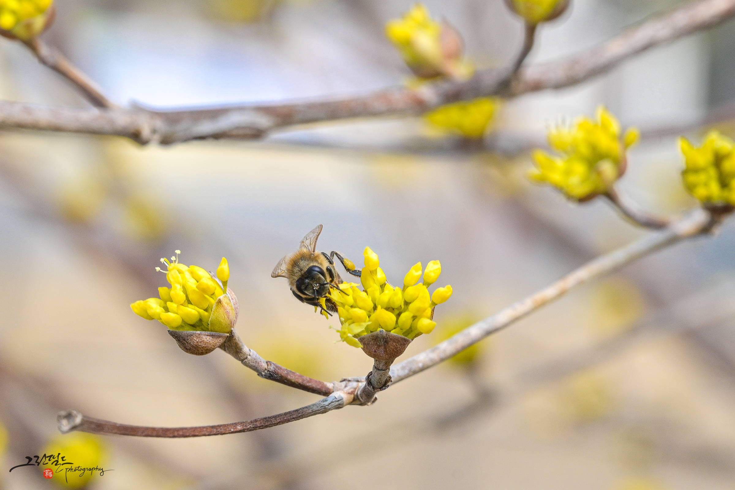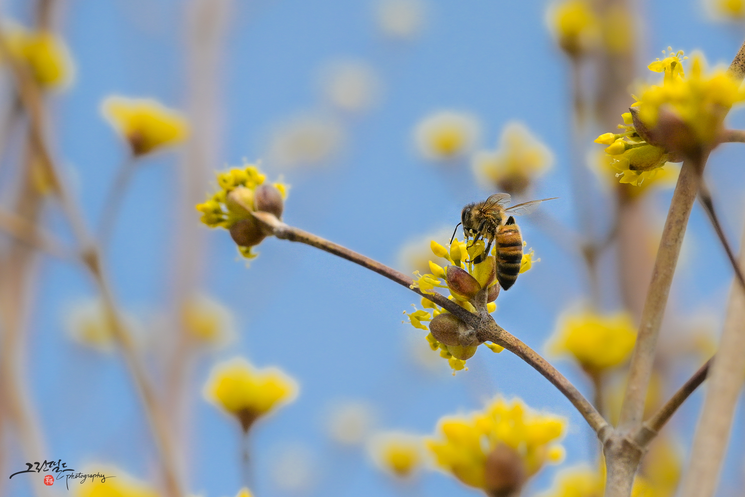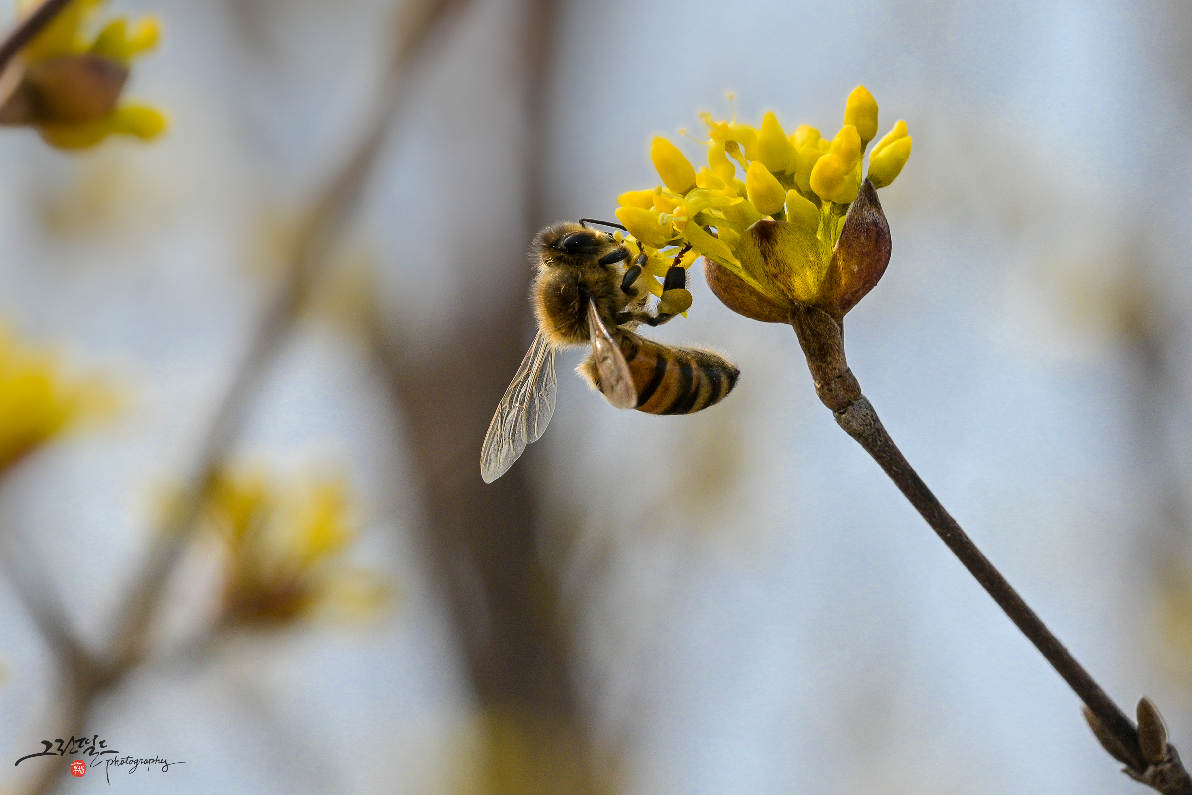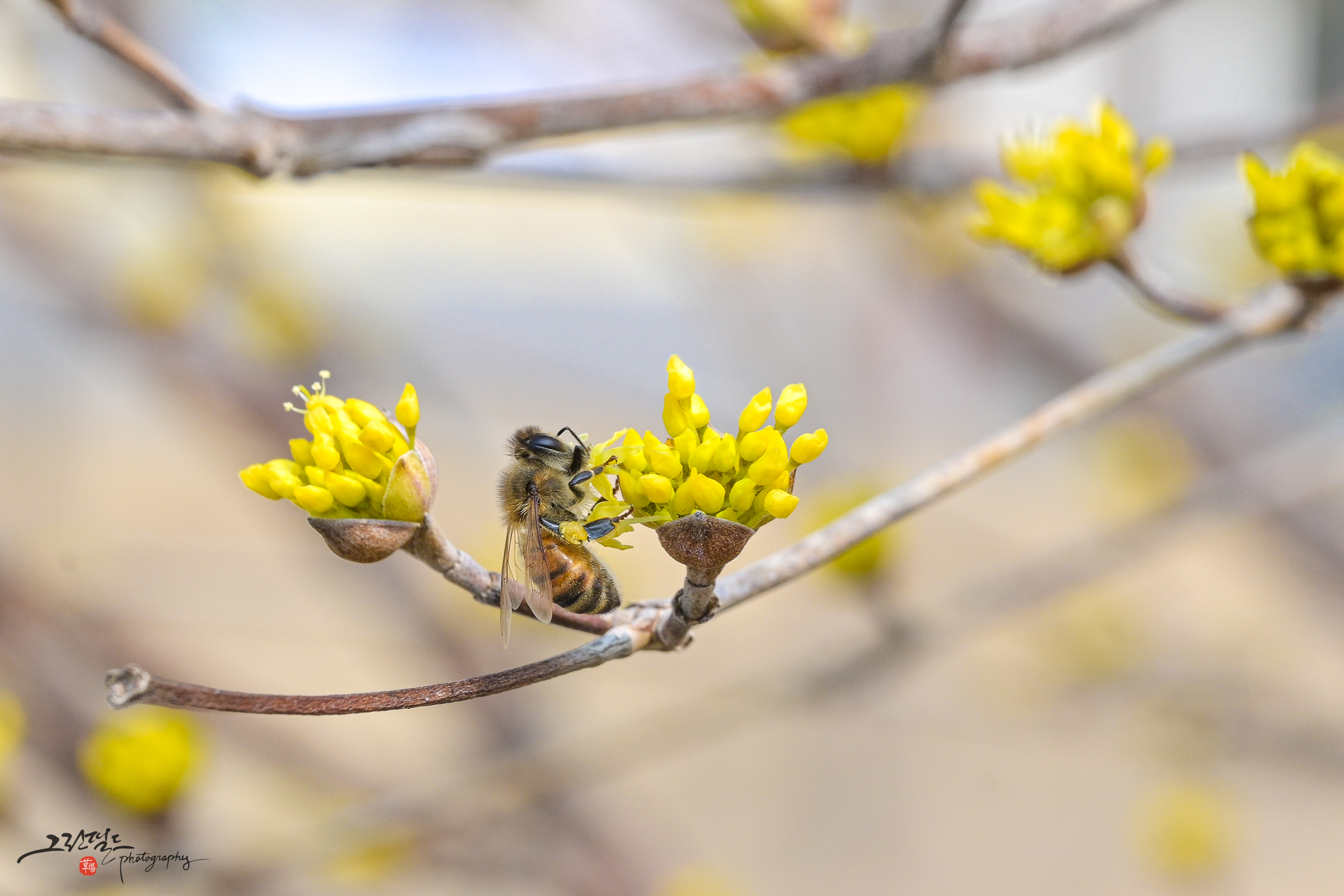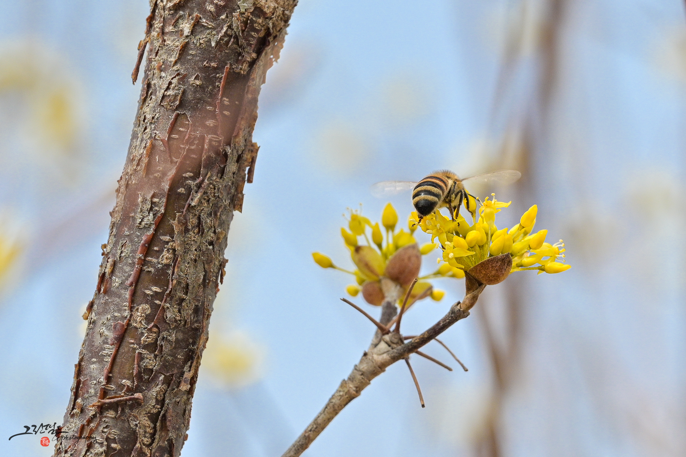 산수유 꽃과 꿀벌의 데이트