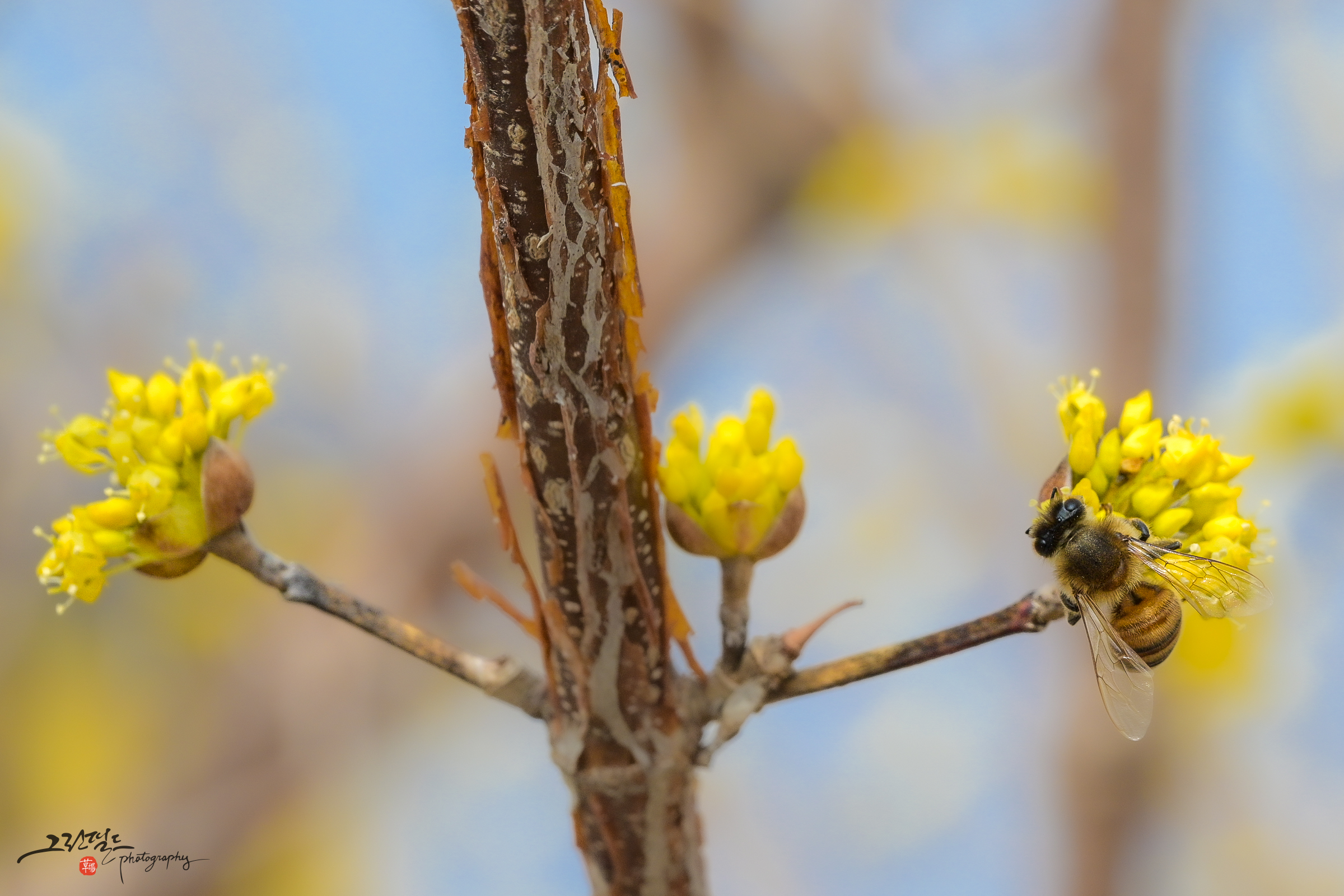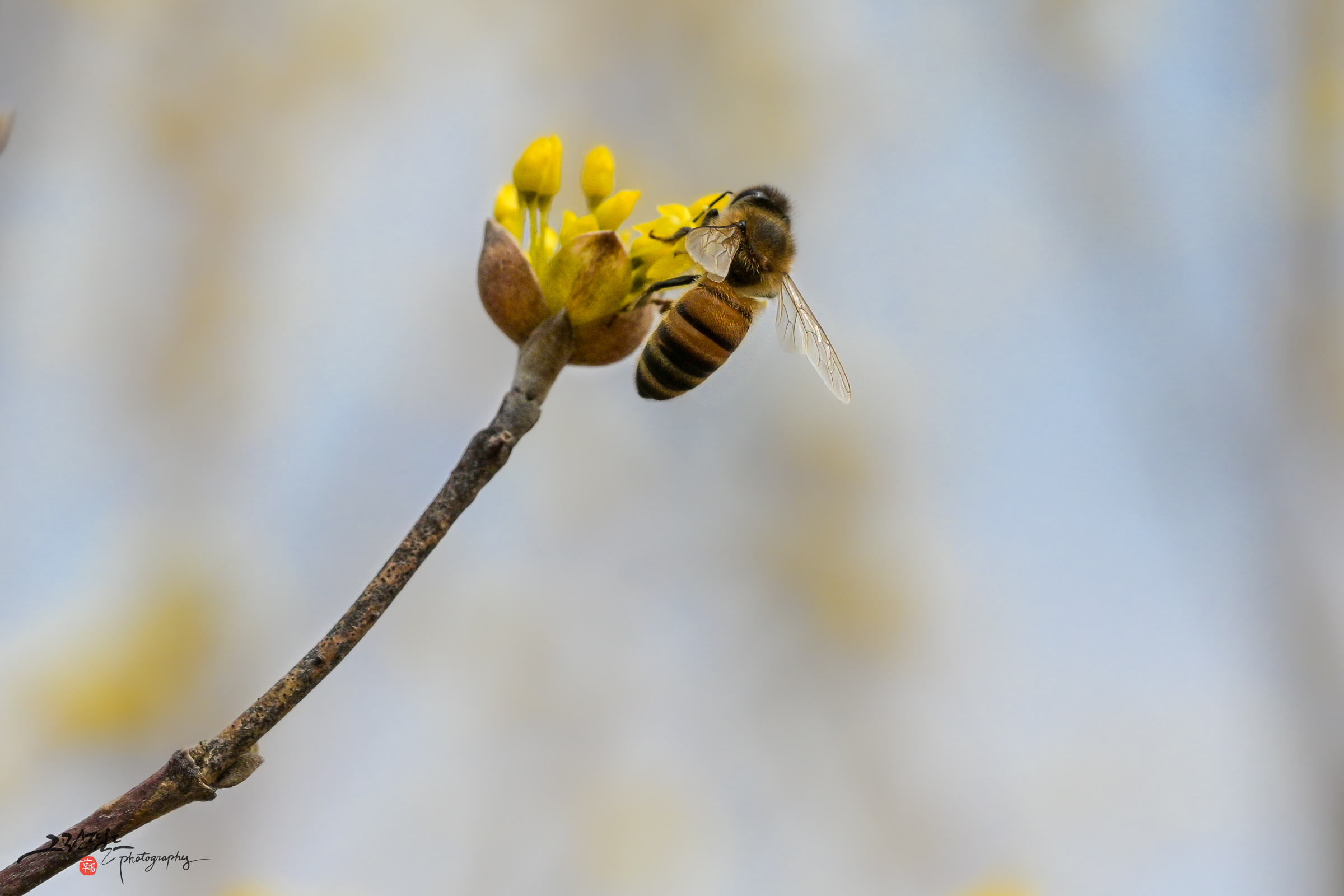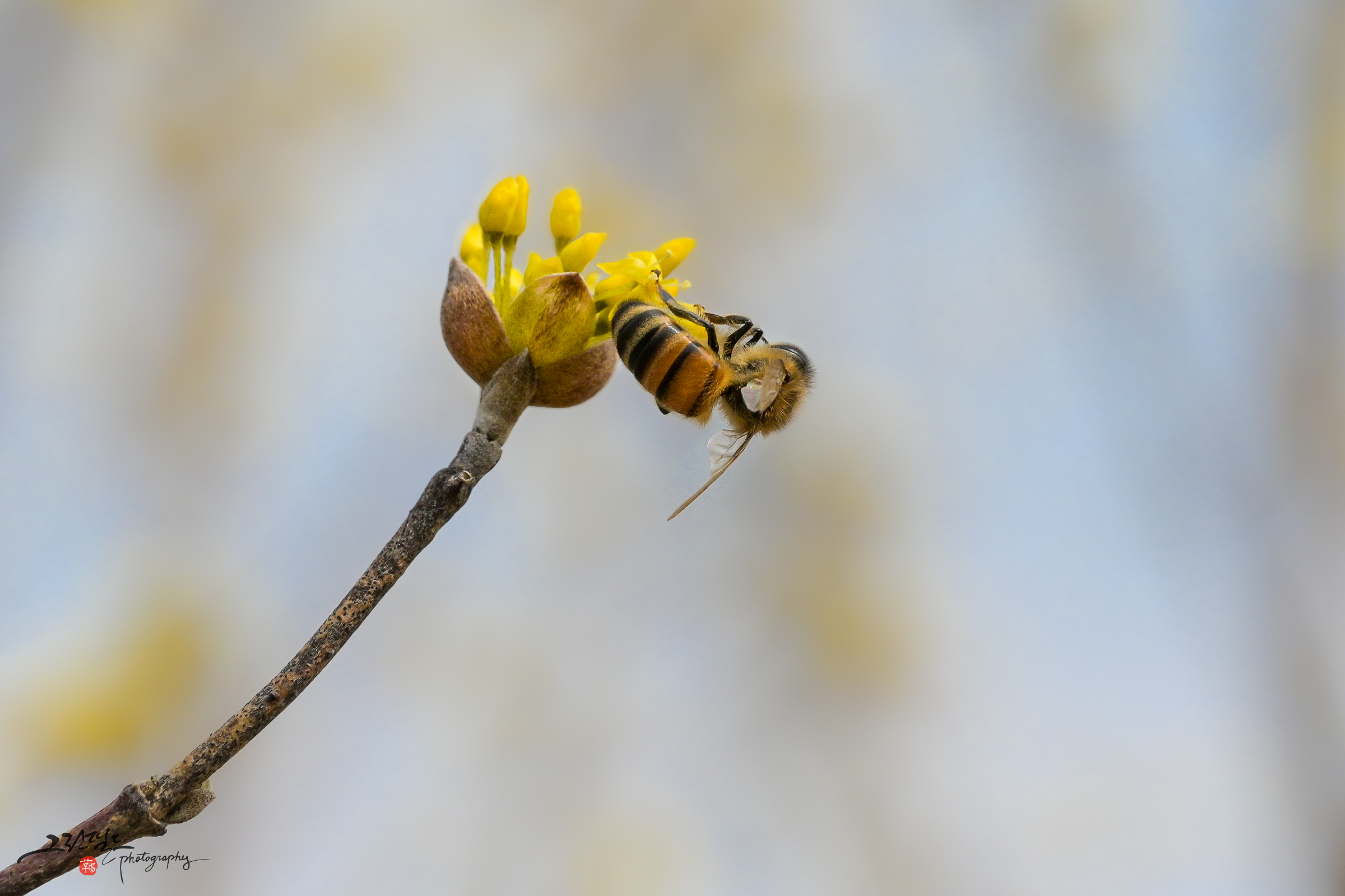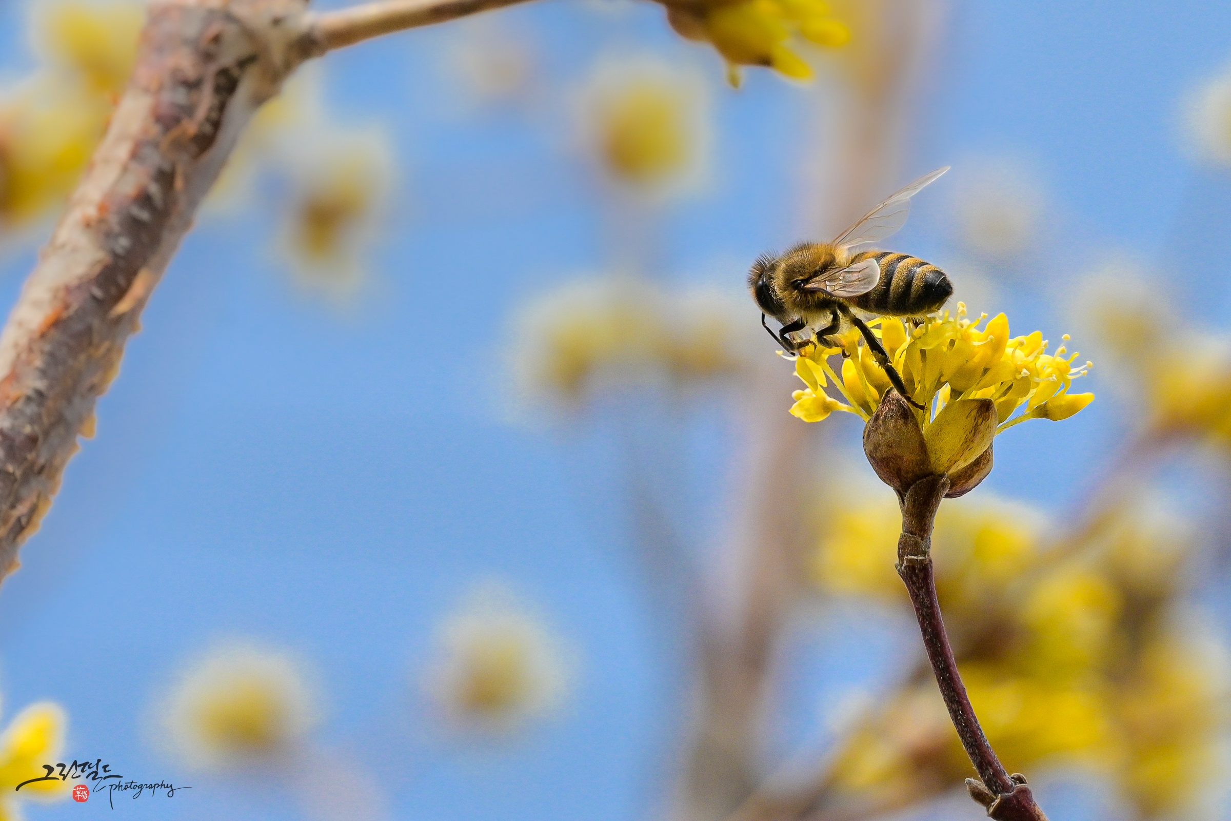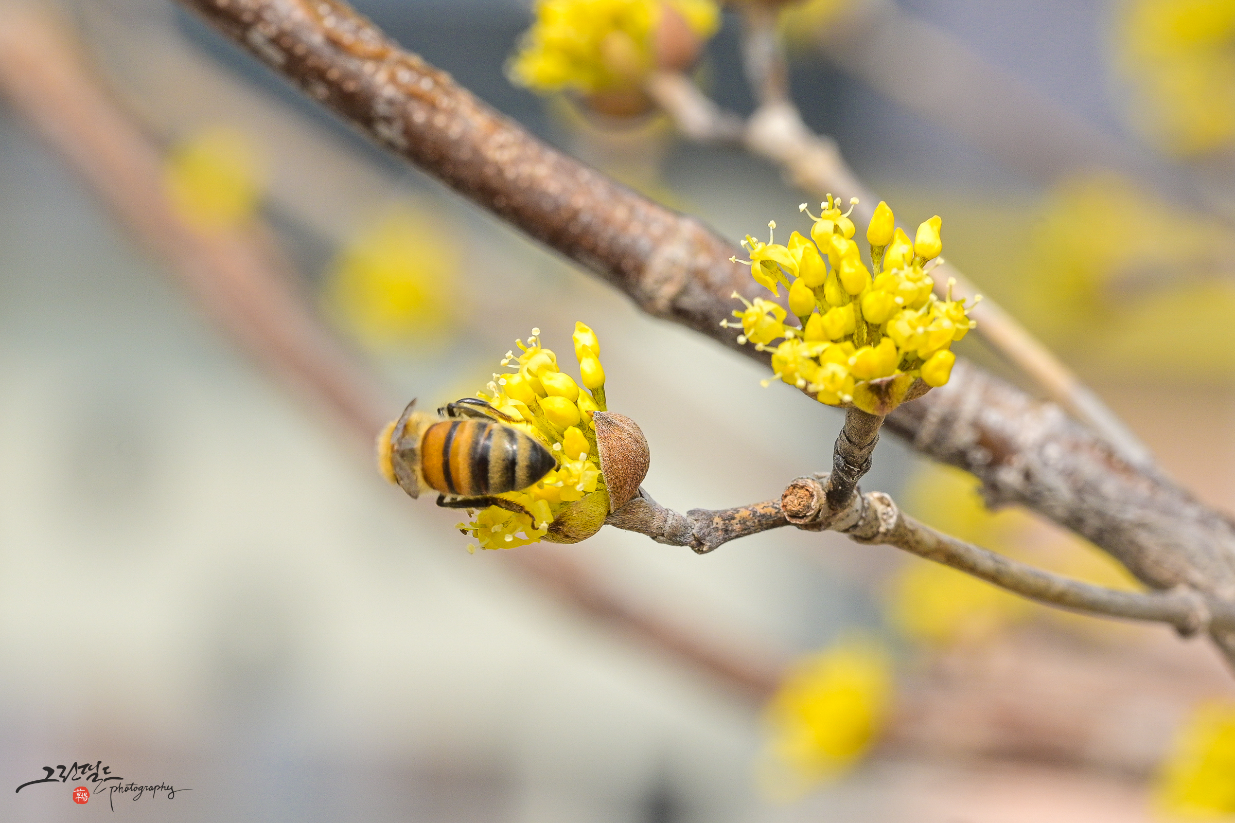 산수유 꽃과 꿀벌의 데이트