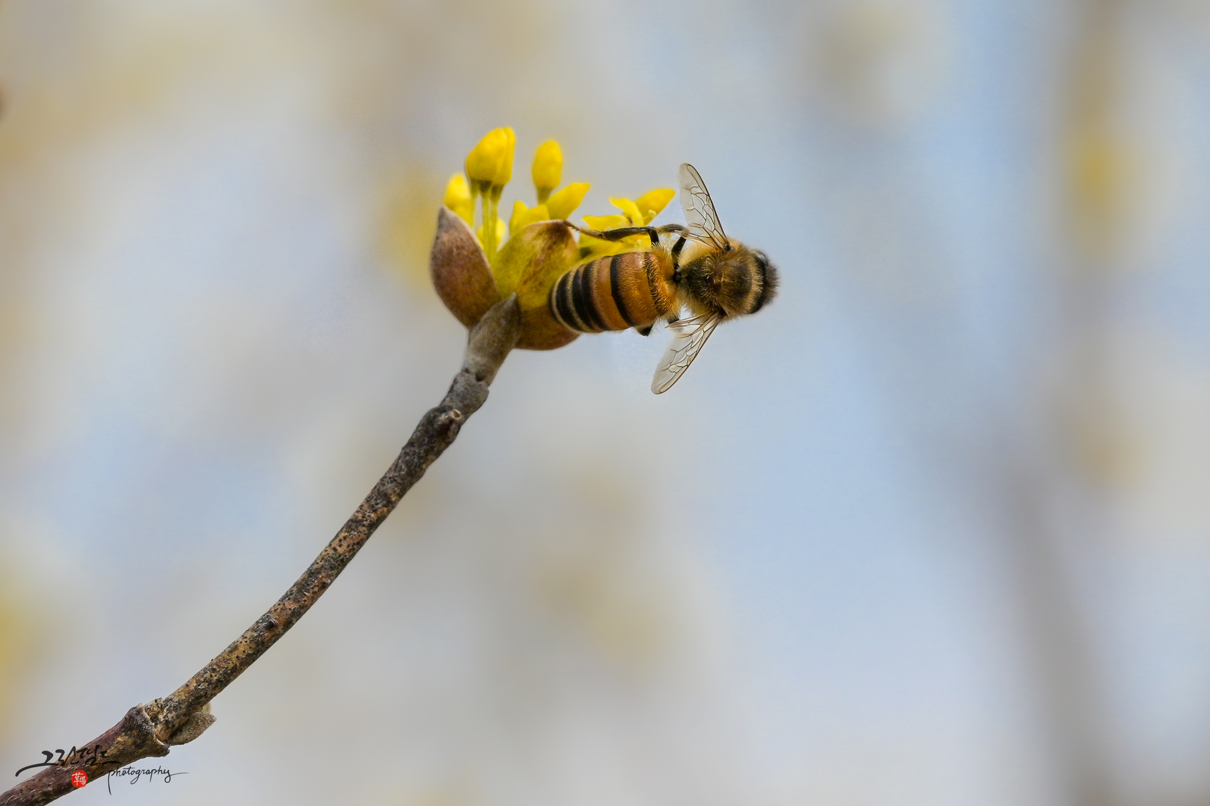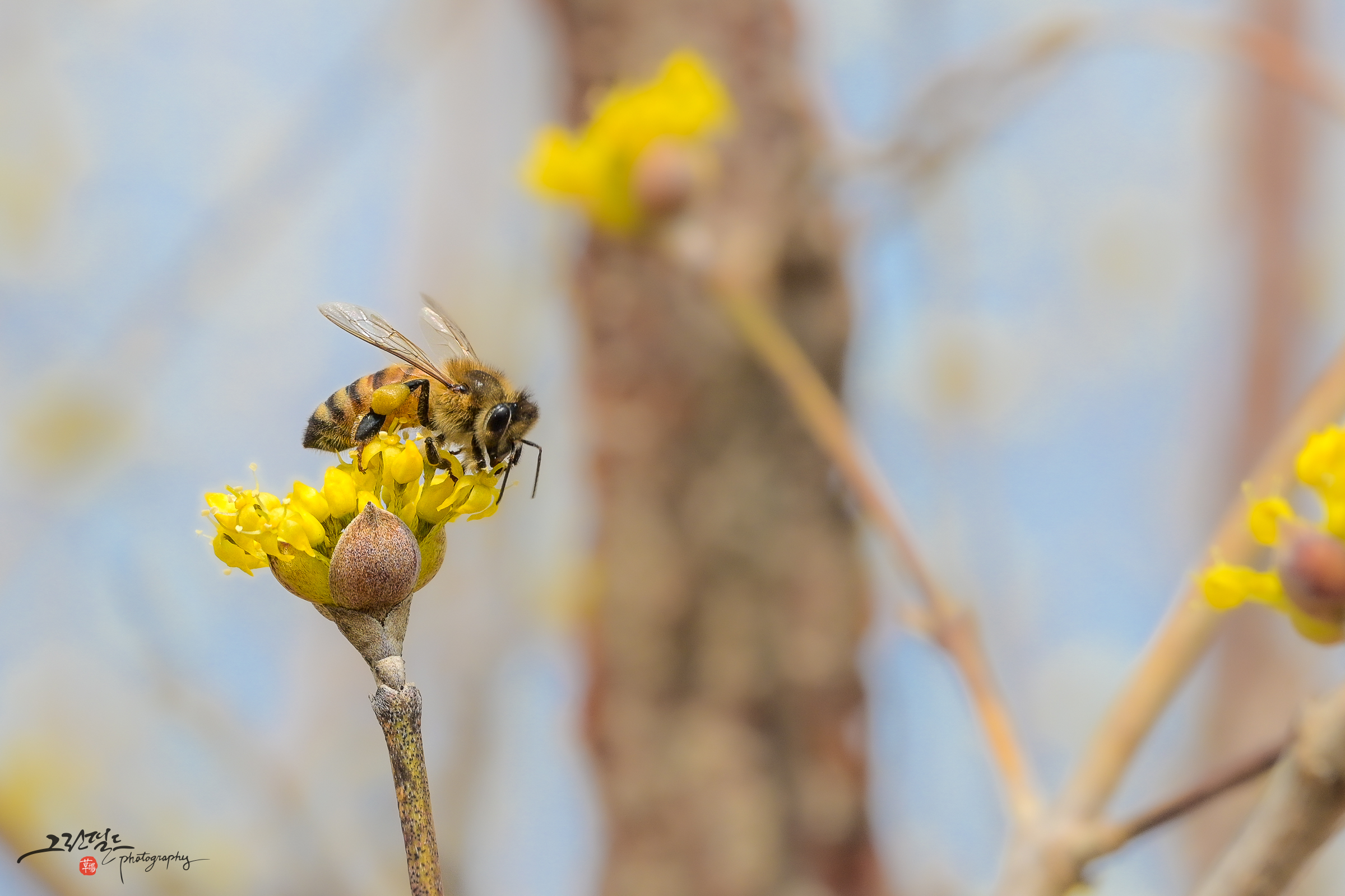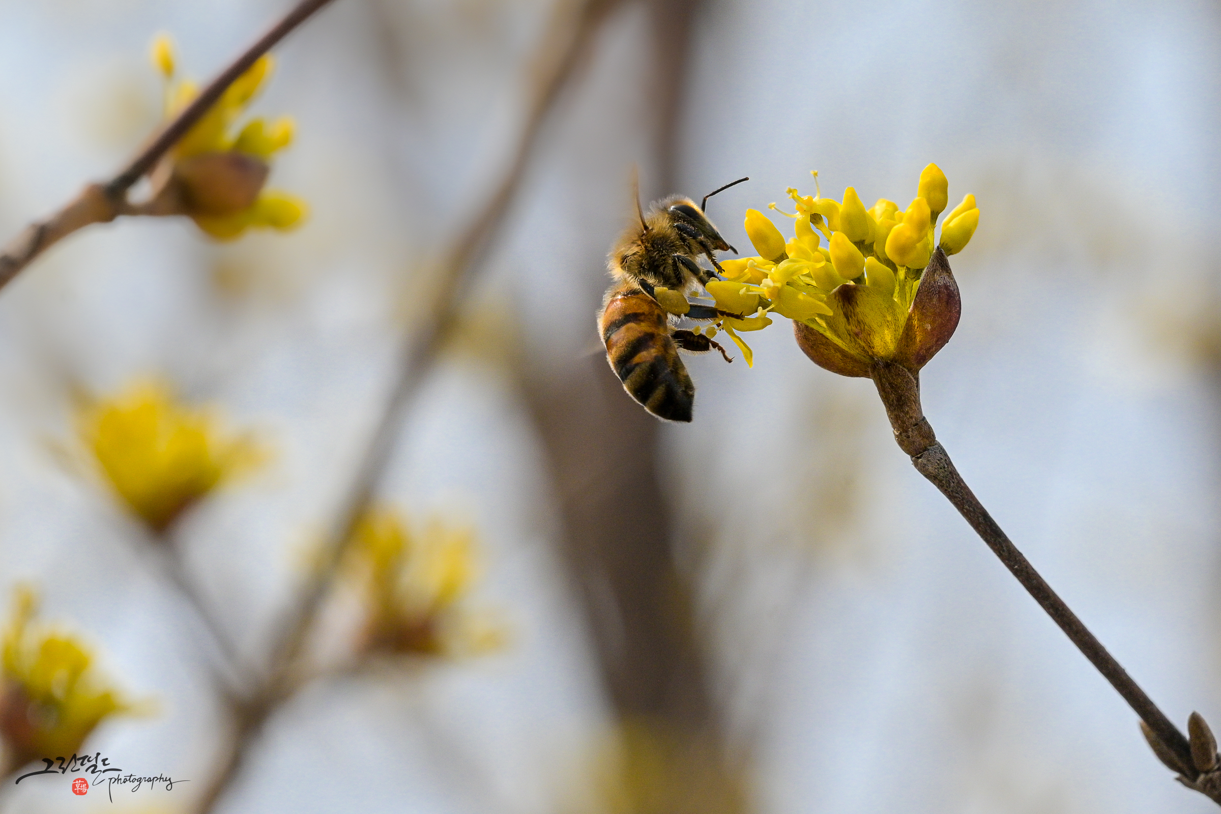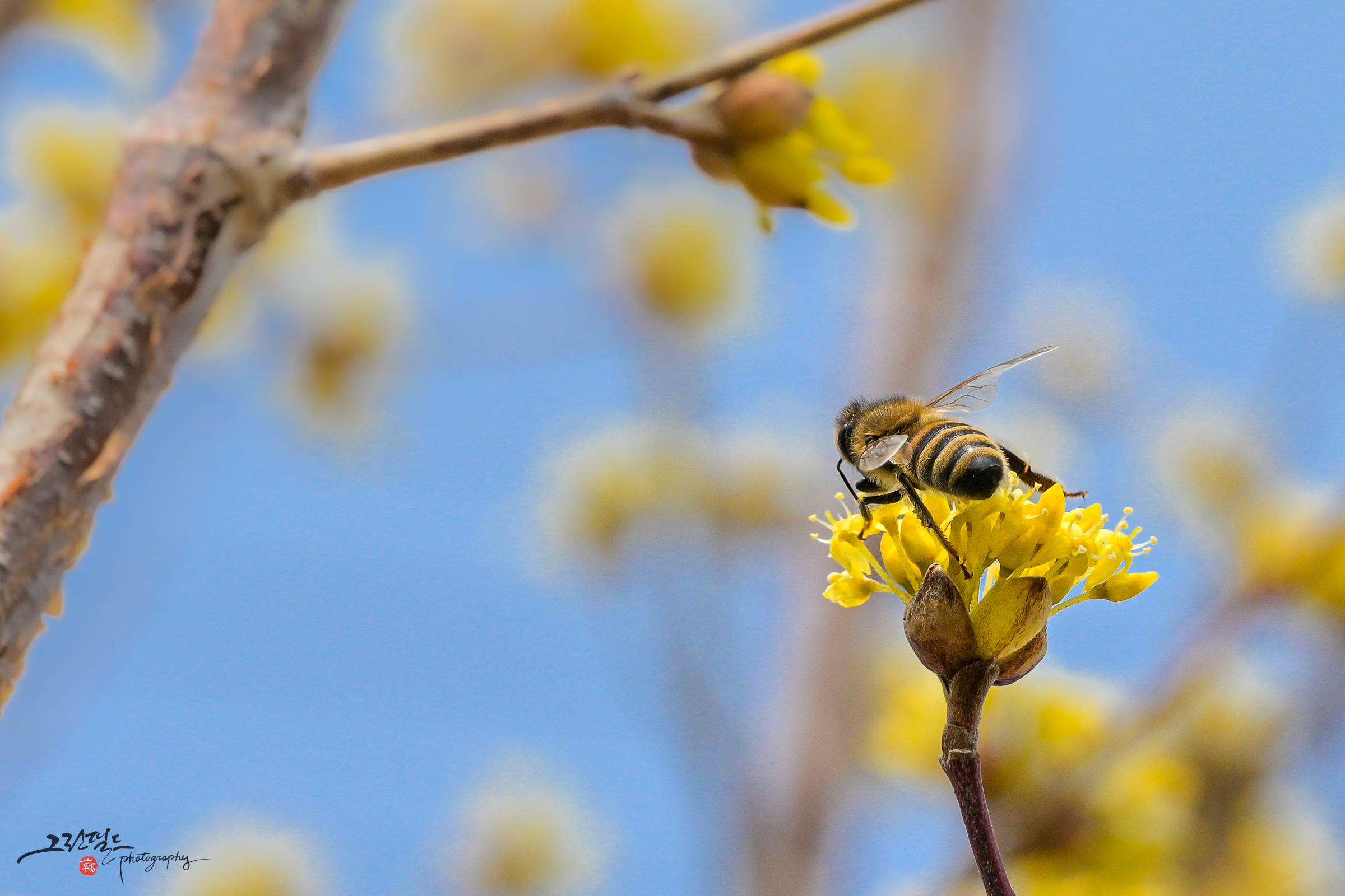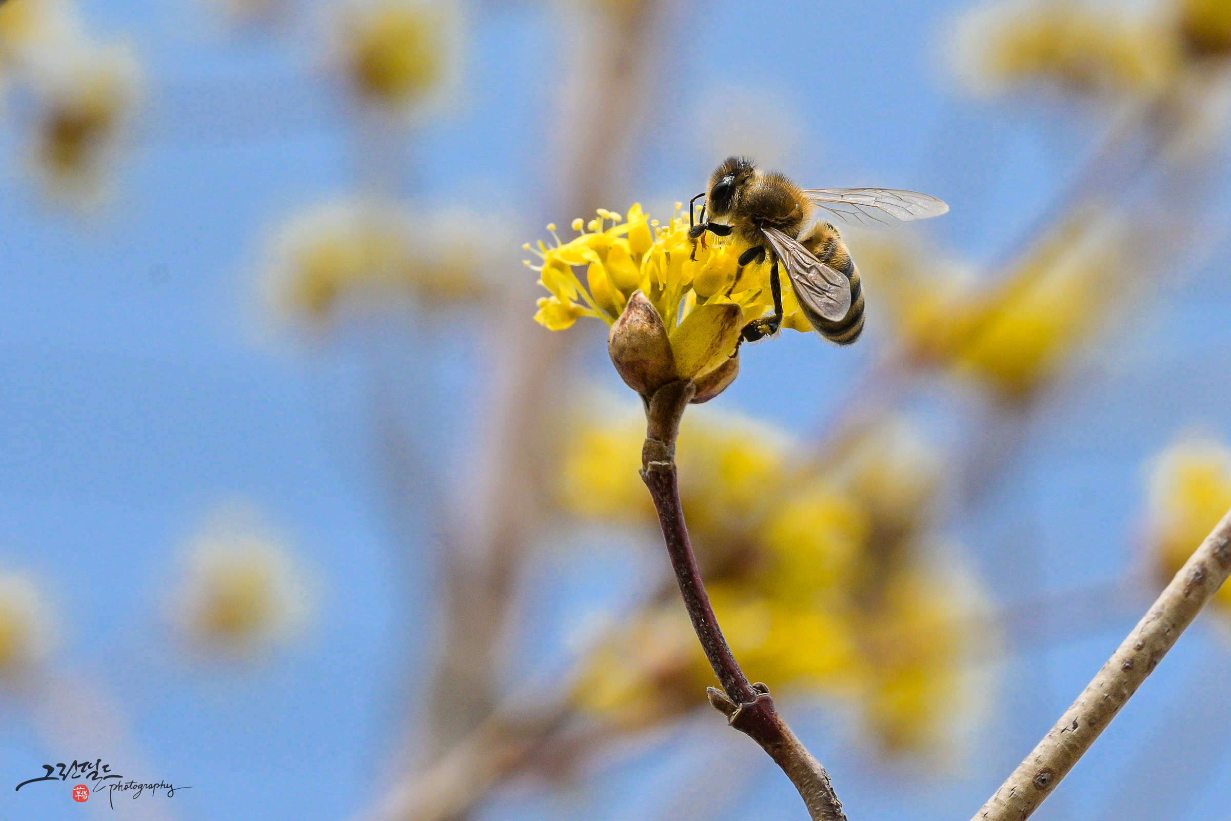 산수유 꽃과 꿀벌의 데이트