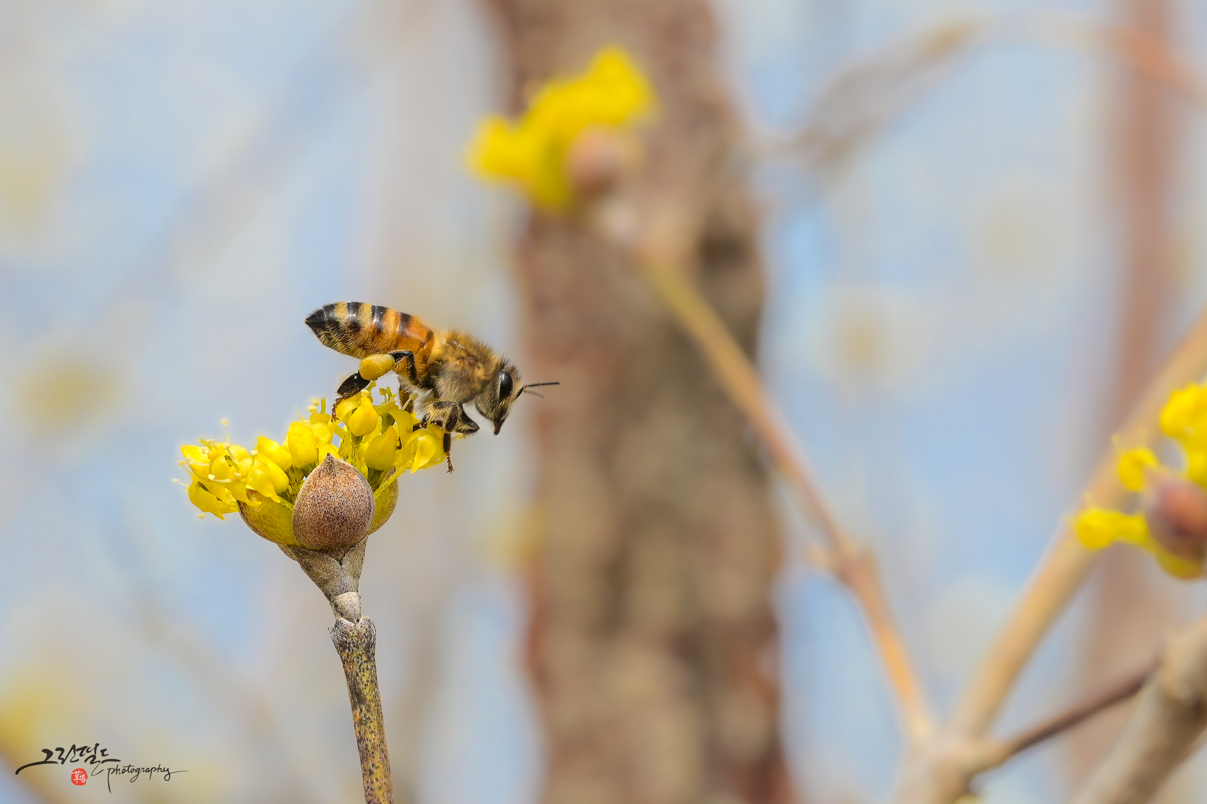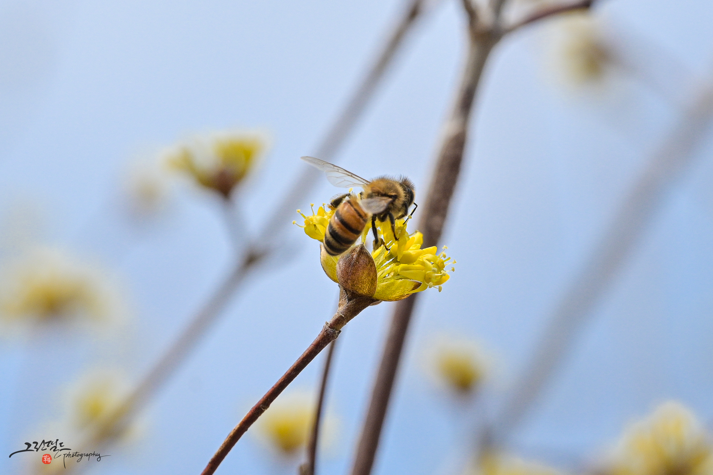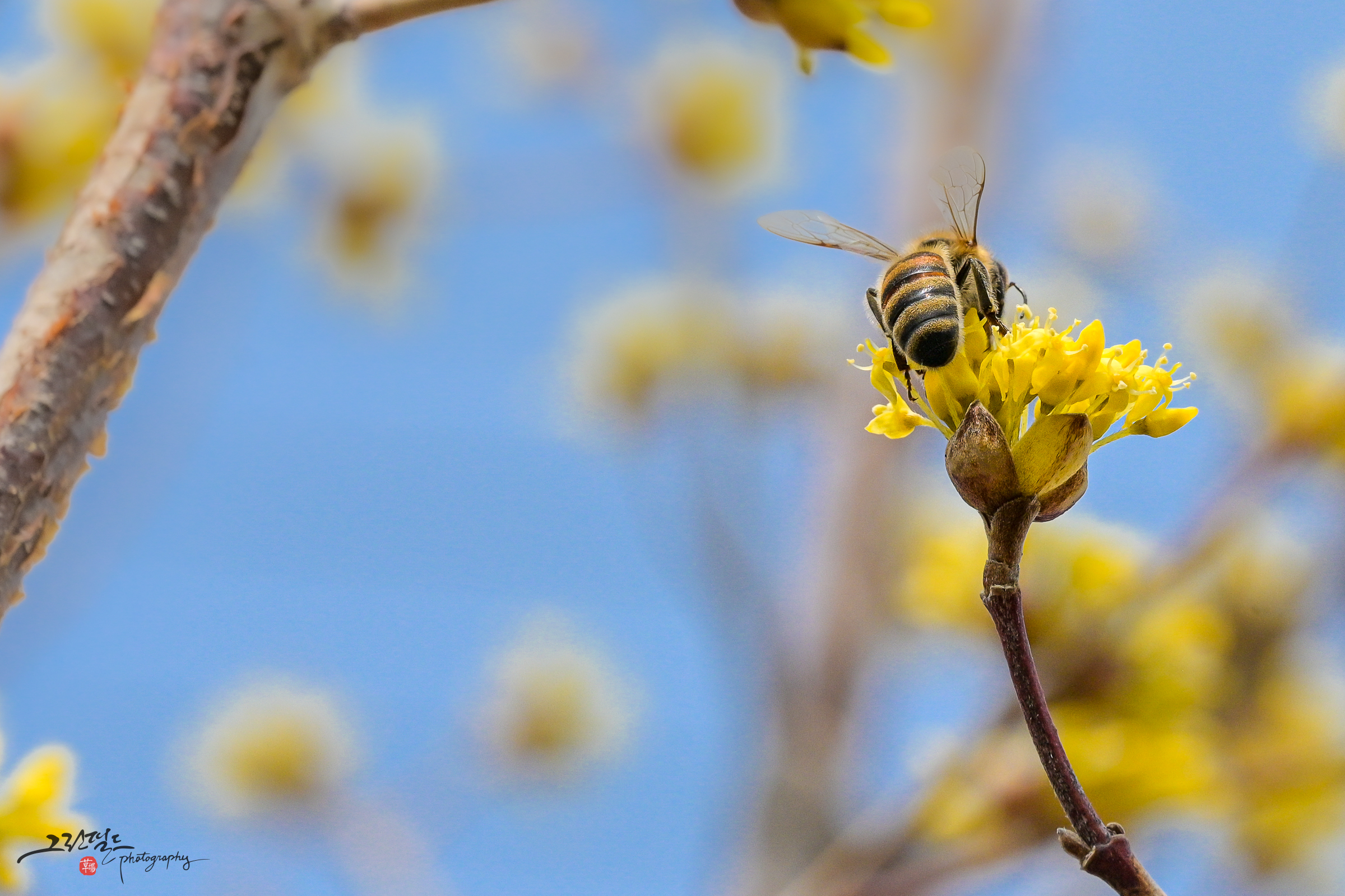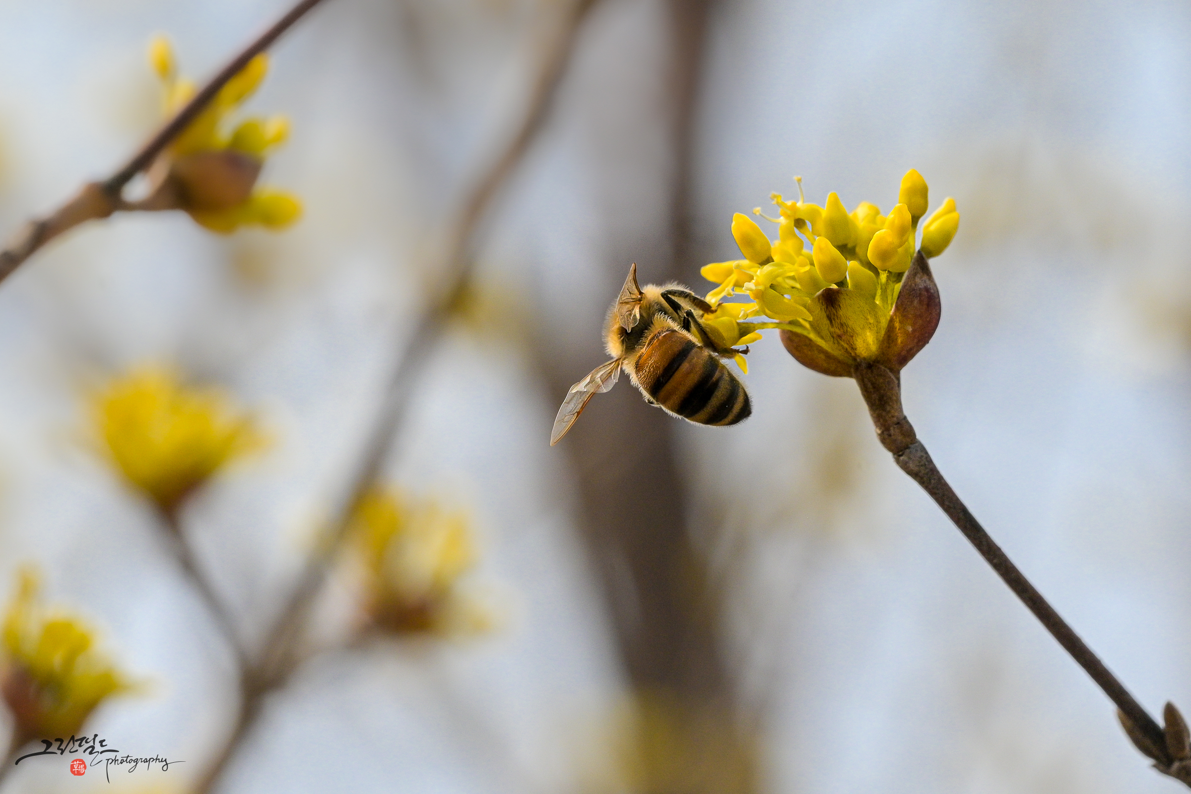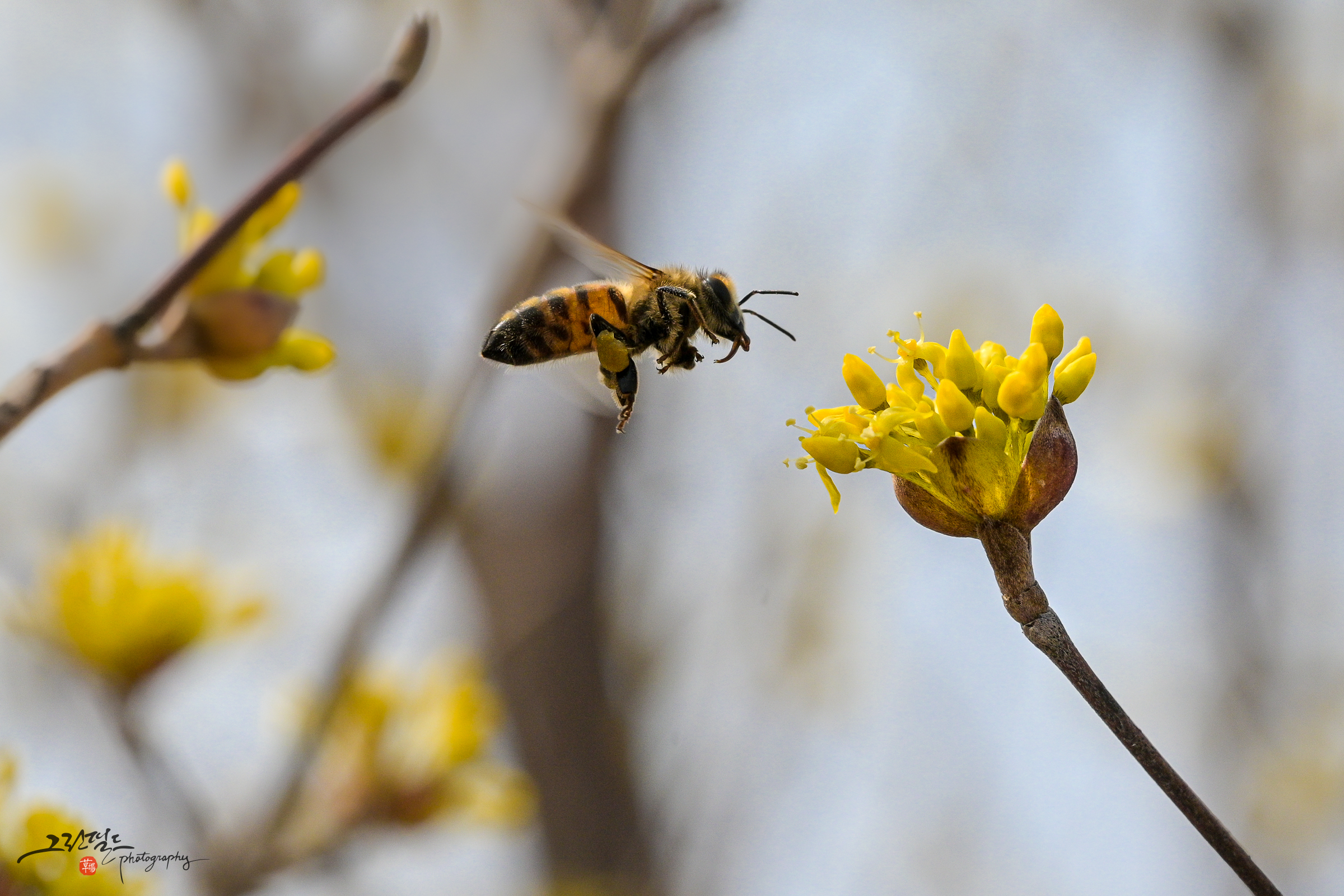 산수유 꽃과 꿀벌의 데이트